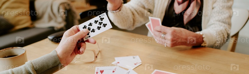 Старшие женщины играют в карточную игру вместе на деревянном столе внутри дома