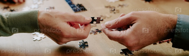 Старшая женщина и мужчина среднего возраста собирают вместе головоломку