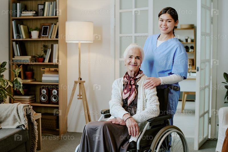Пожилая женщина-инвалид сидит в инвалидном кресле с улыбающейся медсестрой