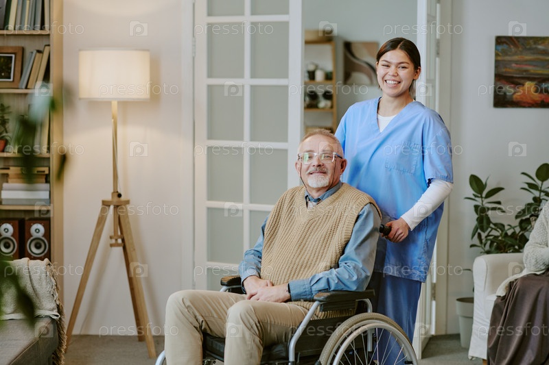 Портрет пожилого человека с инвалидностью, сидящего с медсестрой-молодым взрослым