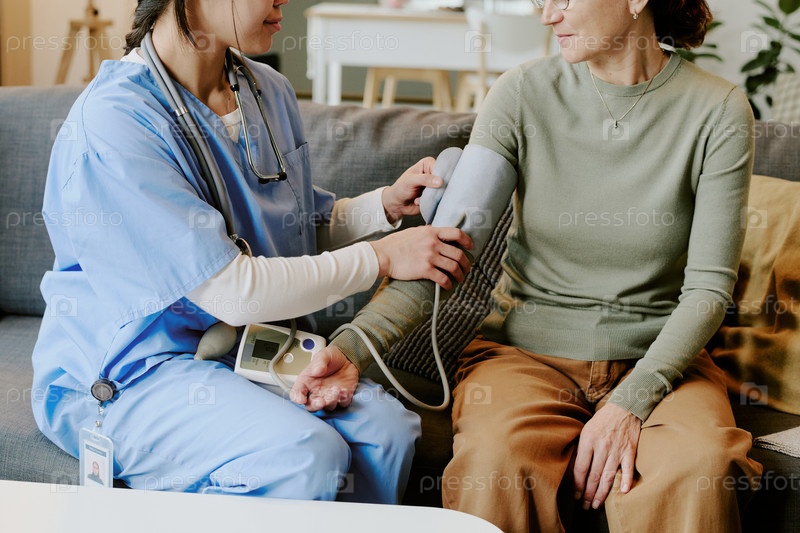 Женщина среднего возраста, которой медсестра измерила кровяное давление