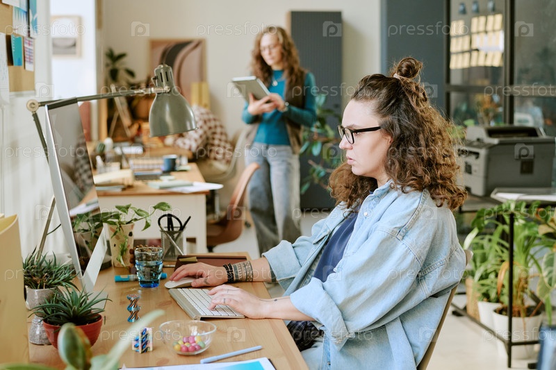 Молодая женщина работает на компьютере в современной офисной среде