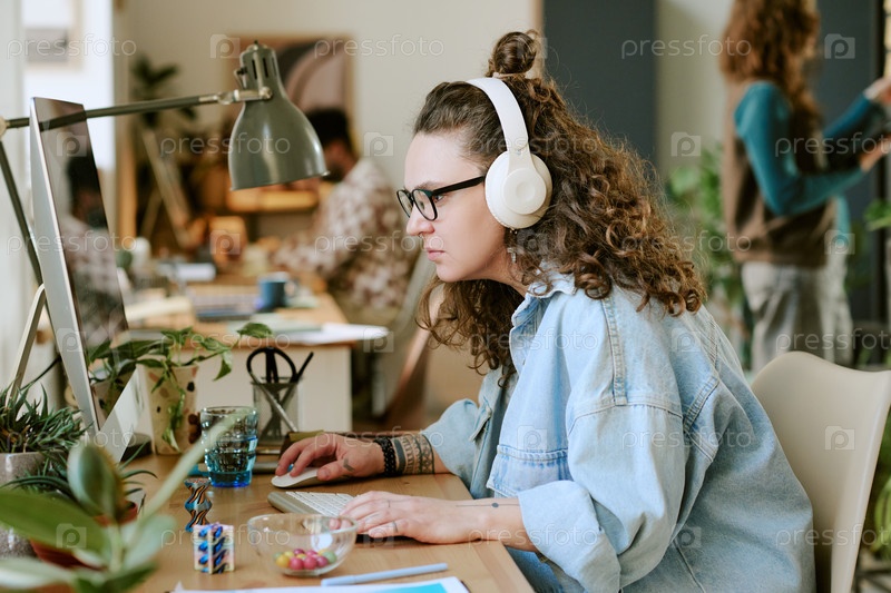 Молодая женщина с наушниками работает на компьютере в офисе