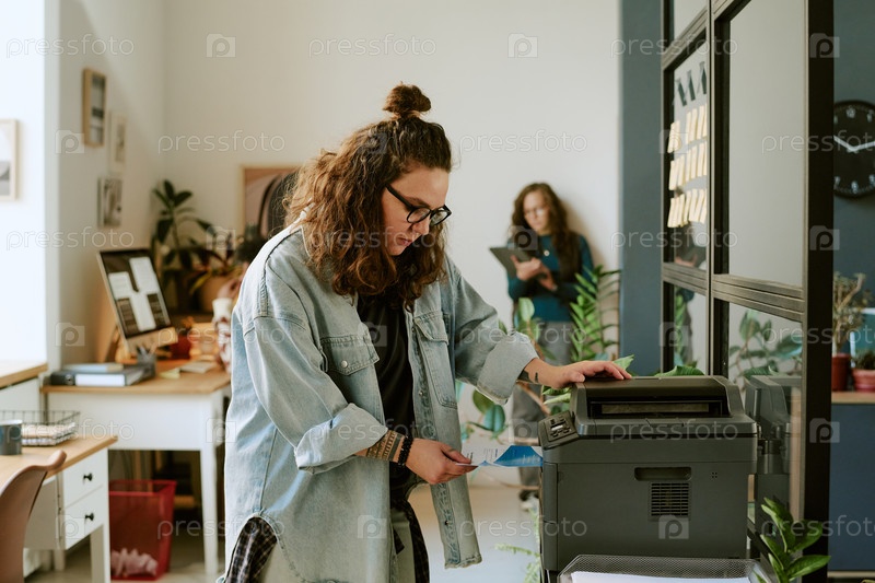 Молодая взрослая женщина, использующая принтер в современной офисной среде