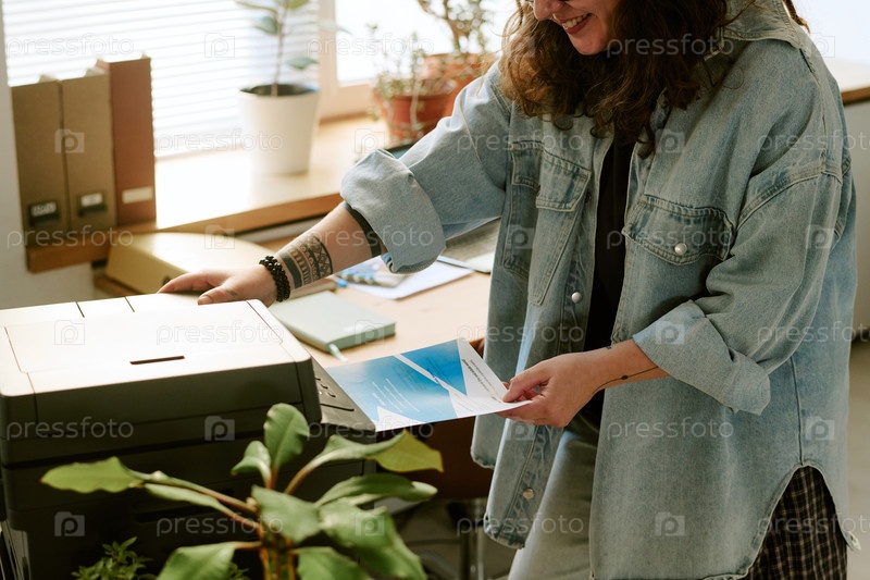 Молодая взрослая женщина улыбается, печатая документы в офисной обстановке