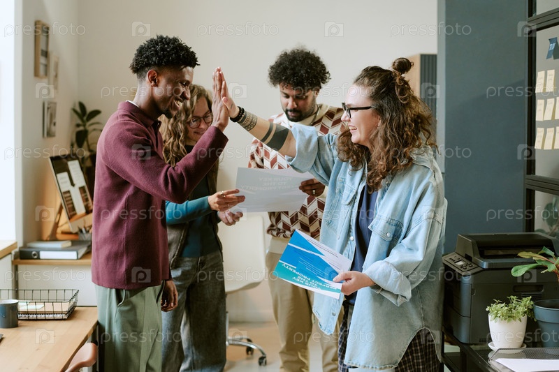 Мультиэтнические молодые взрослые празднуют успех во время командной работы в офисе