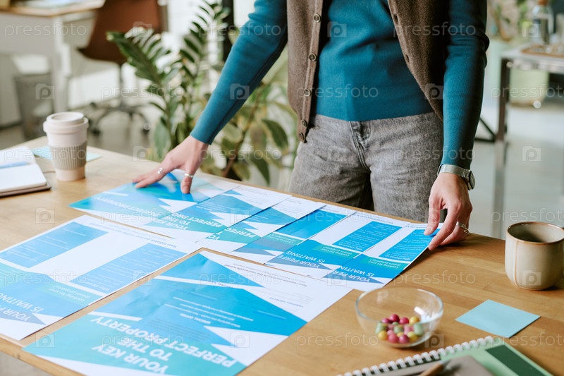 Молодая взрослая женщина просматривает напечатанные деловые документы за рабочим столом