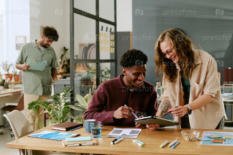 Молодая женщина и чернокожий мужчина сотрудничают над творческим проектом в офисе