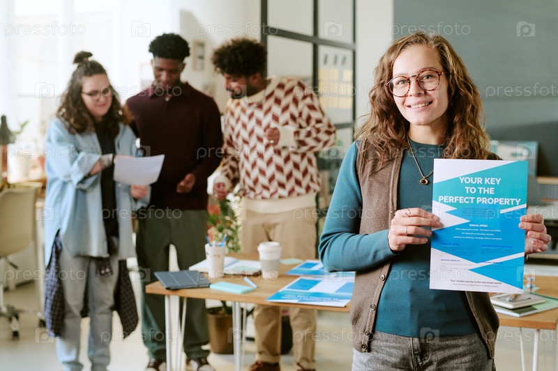 Портрет молодой взрослой женщины, представляющей брошюру о недвижимости