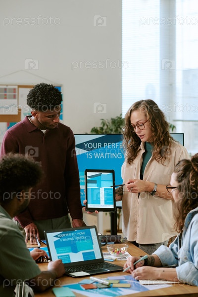 Молодая женщина представляет стратегию цифрового маркетинга для разнообразной команды