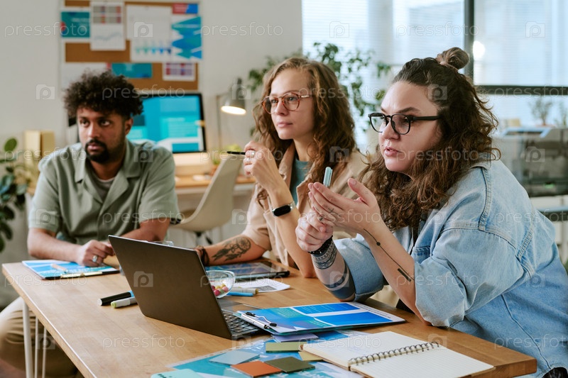 Мультиэтнические молодые взрослые сотрудничают во время деловой встречи в офисе