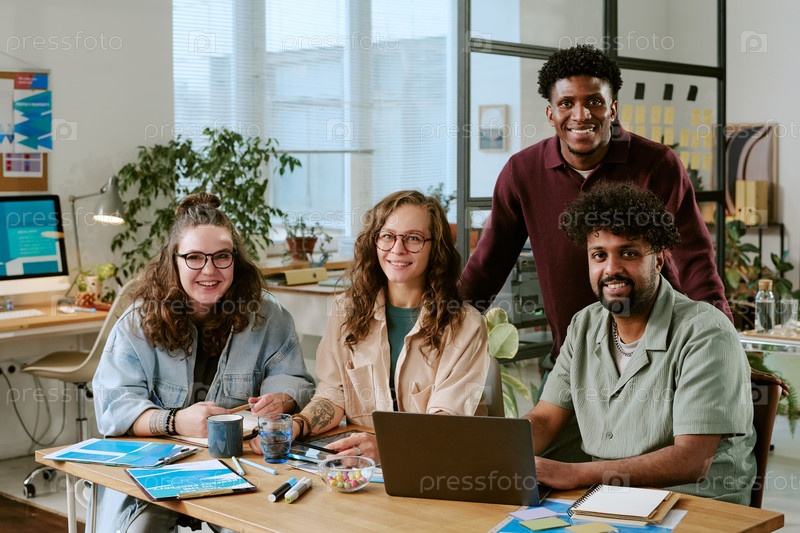 Различные молодые взрослые сотрудничают вокруг ноутбука в современном офисном рабочем пространстве