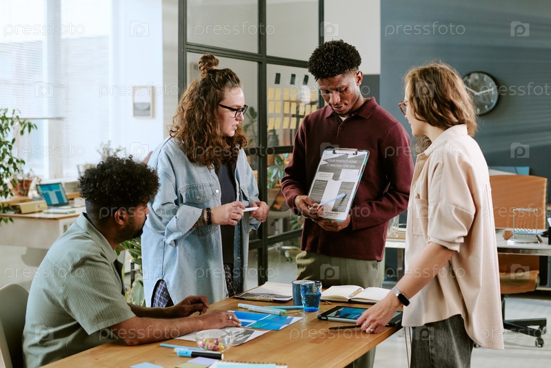 Разнообразные молодые взрослые сотрудничают над проектом в современной офисной обстановке
