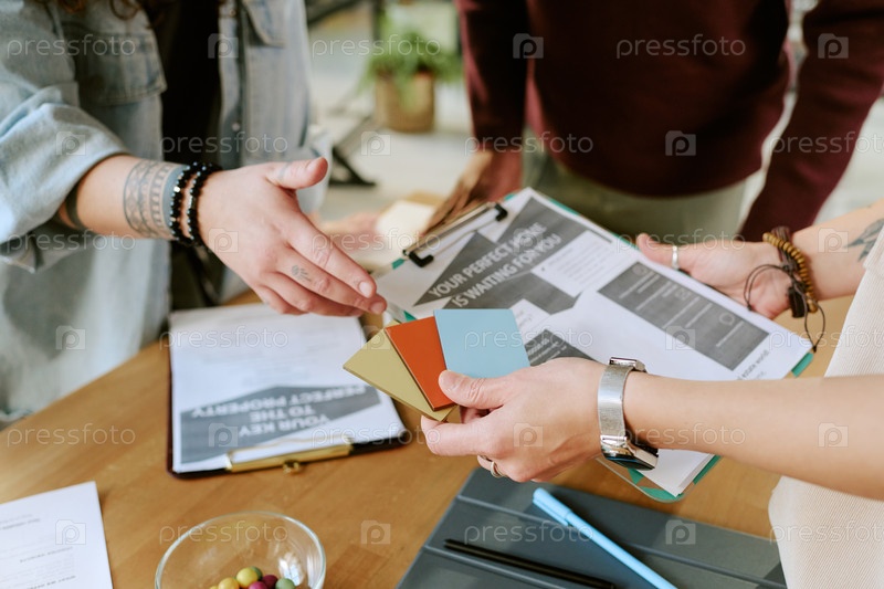 Молодые взрослые женщины и мужчины, сотрудничающие в проекте дизайна интерьера
