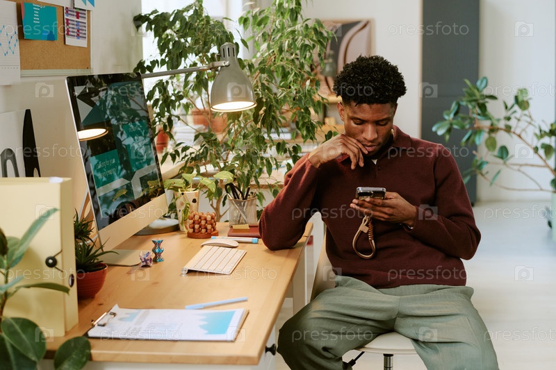 Молодой взрослый чернокожий мужчина использует смартфон, сидя за современным офисным столом
