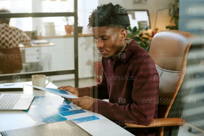 Молодой чернокожий мужчина анализирует финансовые документы в современном офисном рабочем пространстве