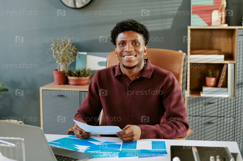 Портрет молодого взрослого чернокожего мужчины, улыбающегося во время работы за офисным столом
