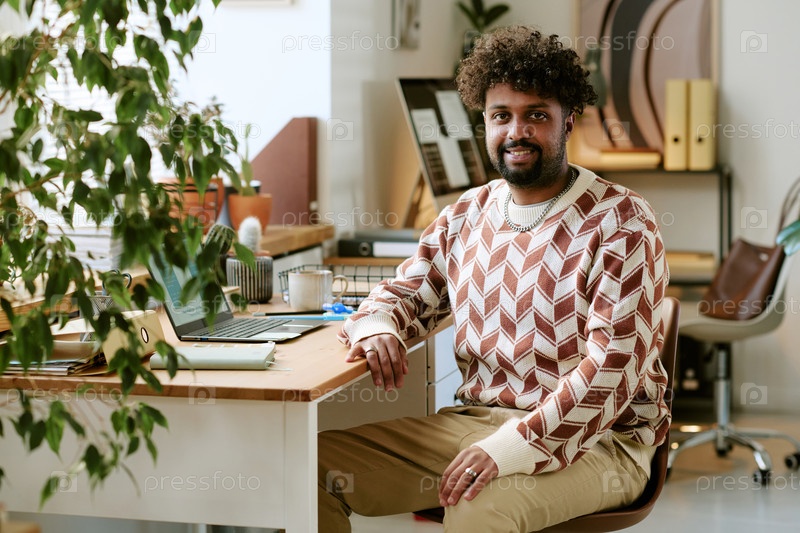 Портрет молодого взрослого чернокожего мужчины, улыбающегося, сидящего за рабочим столом