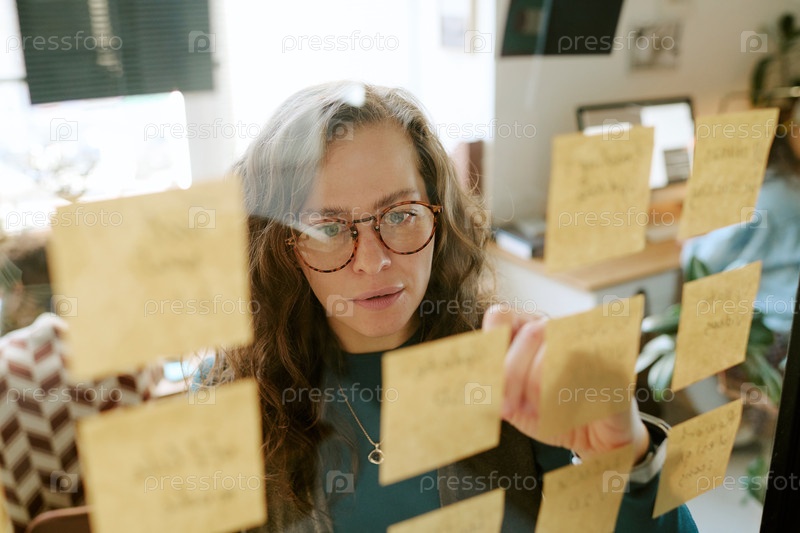 Молодая взрослая женщина планирует стратегию проекта с помощью клейких записок