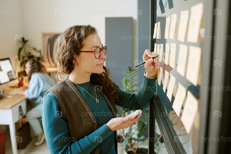 Молодая взрослая женщина пишет заметки на клейких записках во время мозгового штурма