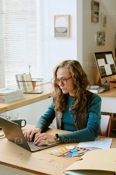 Молодая взрослая женщина работает на ноутбуке в современной домашней конторе
