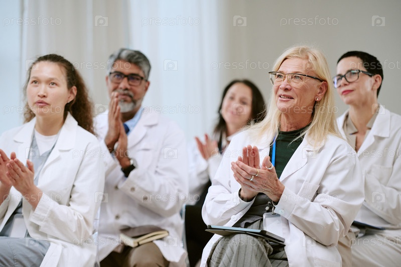 Группа врачей среднего и старшего возраста, аплодирующих во время медицинского семинара