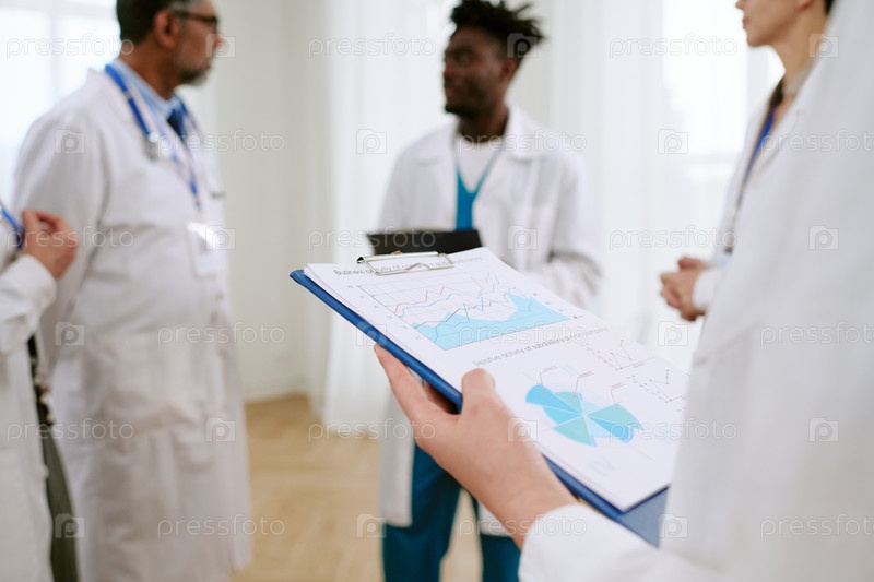 Группа многоэтнических молодых врачей-взрослых, обсуждающих медицинские карты в больнице