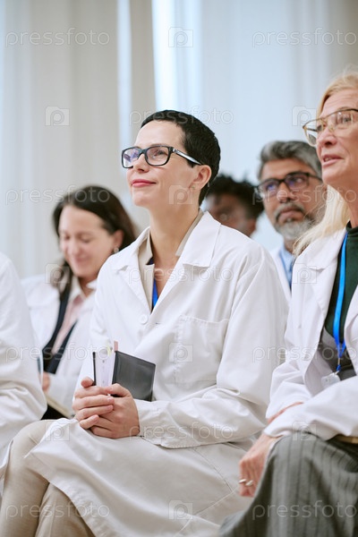 Женщина среднего возраста посещает медицинскую конференцию с коллегами