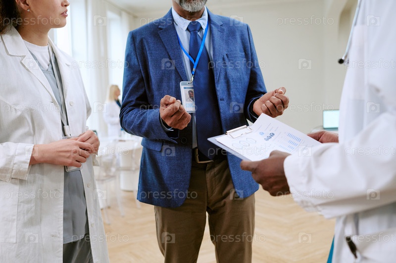 Мужчина средних лет обсуждает медицинский отчет с различными врачами