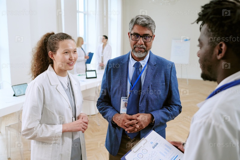 Мультиэтнические медицинские специалисты обсуждают уход за пациентами на встрече в больнице
