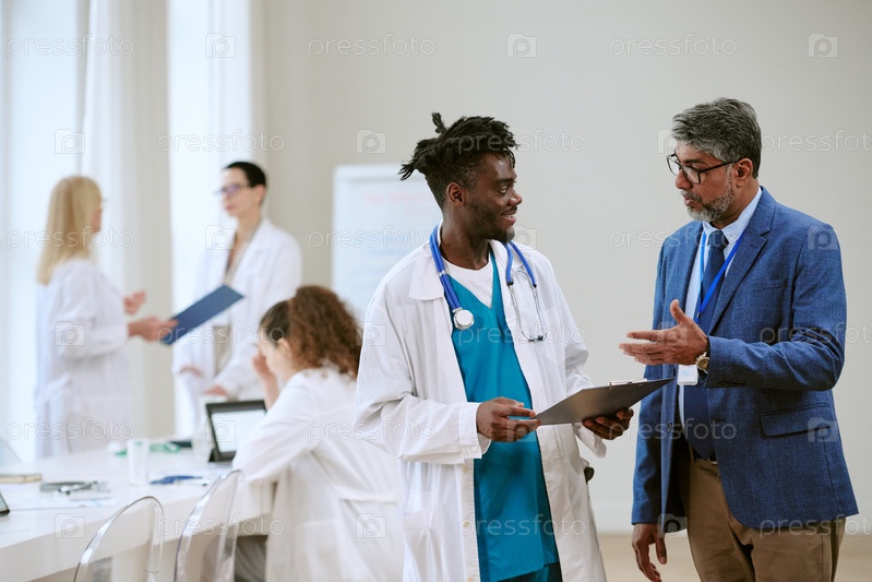 Мужчина среднего возраста консультирует молодого взрослого чернокожего мужчину в медицинском кабинете