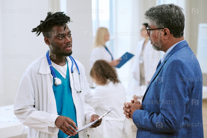 Молодой чернокожий врач обсуждает медицинский отчет с мужчиной среднего возраста