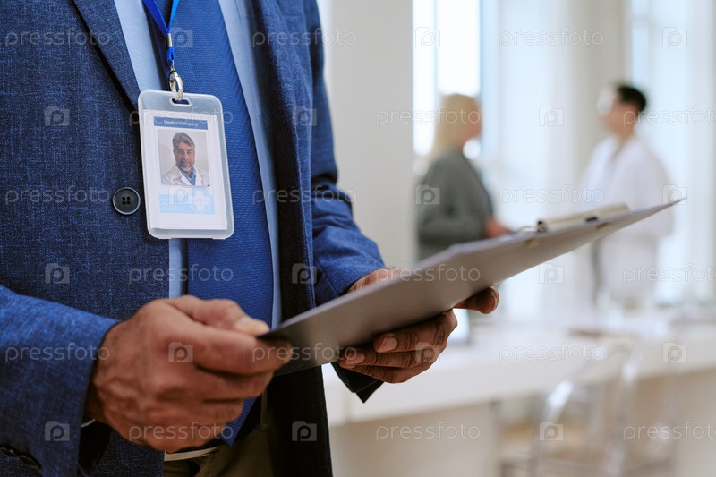Мужчина среднего возраста держит клипборд в современном медицинском кабинете