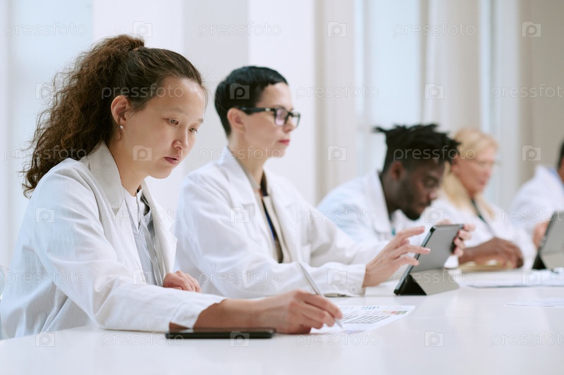 Разнообразная группа молодых взрослых ученых, сотрудничающих во время лабораторной встречи