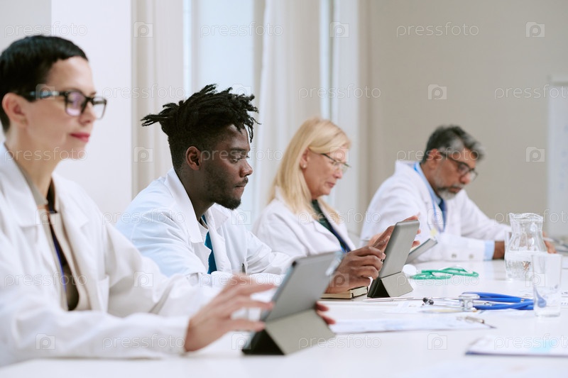 Мультиэтническая команда врачей среднего и молодого возраста, использующих цифровые планшеты