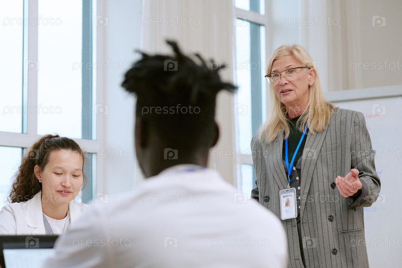 Женщина среднего возраста ведет дискуссию с различными молодыми взрослыми