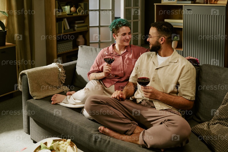 Молодая женщина и молодой мужчина расслабляются вместе, пьют вино в помещении