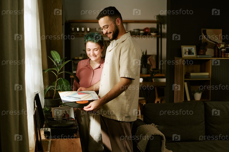 Молодая женщина и молодой человек вместе слушают виниловые пластинки