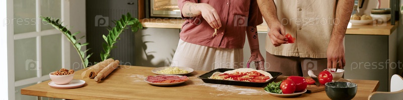 Заголовок молодой взрослой пары, собирающей домашнюю пиццу со свежими ингредиентами