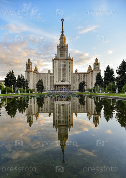 Величественное главное здание МГУ отражается в спокойном пруду на закате