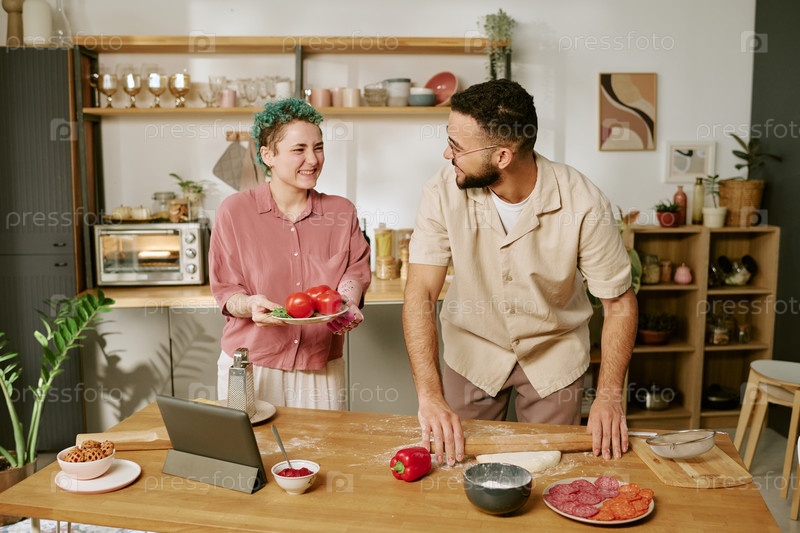 Молодая женщина и готовящая домашнюю пиццу вместе