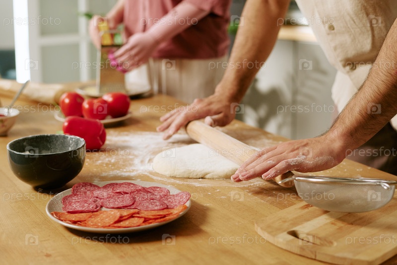 Взрослый мужчина прокручивает тесто, в то время как молодая женщина жарит сыр поблизости