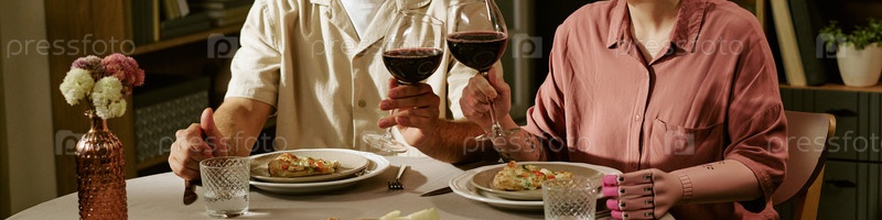 Header of Молодая пара тостирует винные бокалы, наслаждаясь романтическим ужином