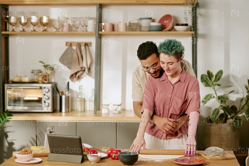 Женщина с протезированной рукой выпекает молодого человека, обнимающего его