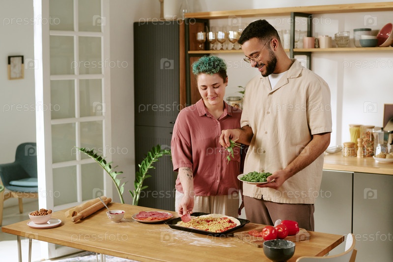 Молодая женщина с протезированной рукой и молодой человек вместе делают пиццу