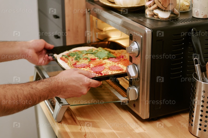 Молодой взрослый мужчина выпекает домашнюю пиццу в современной кухонной печи