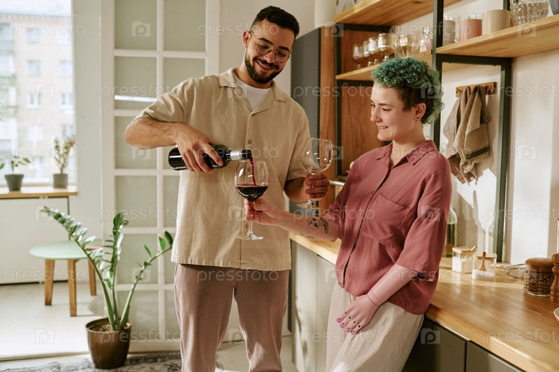 Молодой человек наливает красное вино молодой женщине на кухне
