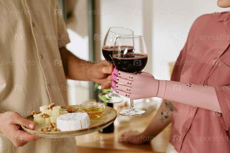 Молодая взрослая женщина с протезируемой рукой тостирует вино с мужчиной