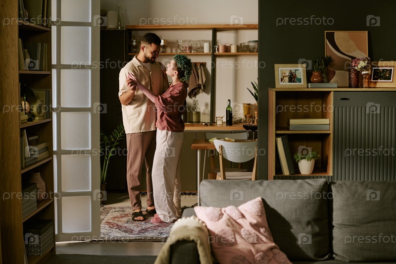 Молодая мультиэтническая пара, танцующая вместе в уютной современной квартире