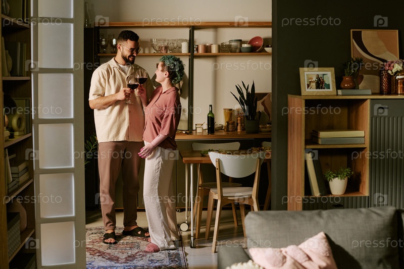 Молодой мужчина и молодая женщина тостируют вино в современной квартире